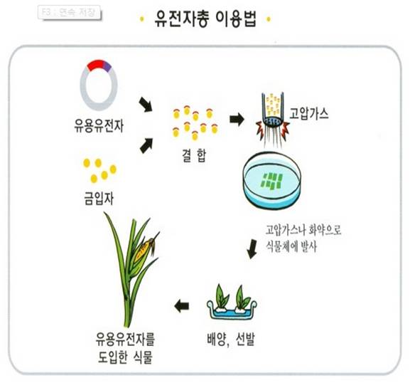 금 또는 텅스텐 등 금속미립자에 유용한 유전자를 코팅하고 고압가스의 힘으로 식물의 잎 또는 세포 덩어리에 투입하여 유용한 유전자가 물리적으로 식물세포의 염색체에 접촉하도록 함으로서 직접 식물세포내로 도입하는 방법