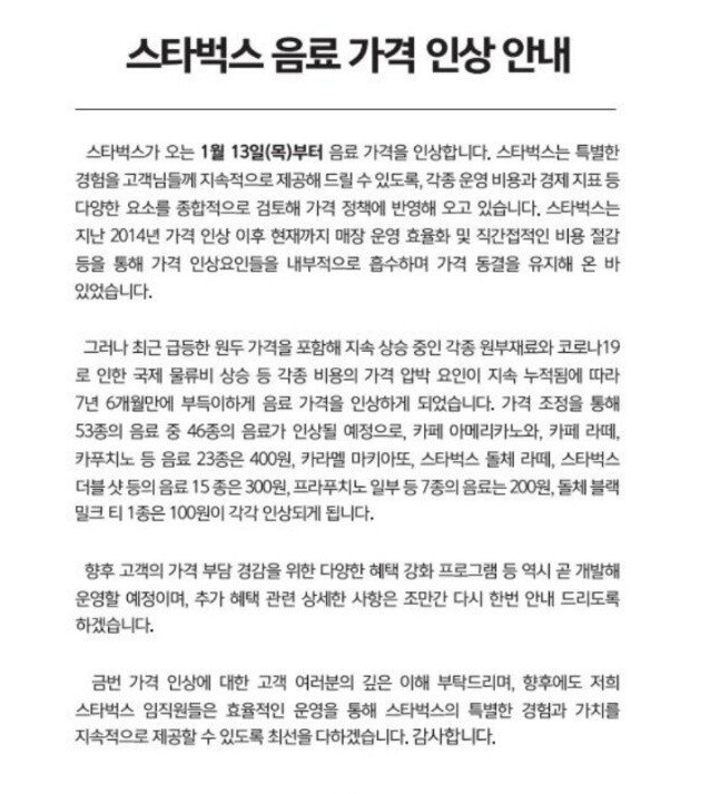 스타벅스는 공식 홈페이지를 통해 "각종 운영 비용과 경제 지표 등 다양한 요소를 종합적으로 검토해 가격 정책에 반영하고 있다"며 "2014년 가격 인상 이후 현재까지 매장 운영 효율화 및 직간접적인 비용 절감을 통해 가격 인상요인을 내부적으로 흡수하며 가격 동결을 유지해온 바 있다"라고 이야기를 시작하였습니다. 이어 "그러나 최근 급등한 원두 가격을 포함해 지속 상승 중인 각종 원부재료와 코로나19로 인한 국제 물류비 상승 등 가격 압박 요인이 지속 누적돼 7년 6개월 만에 부득이하게 가격을 인상하게 됐다. 향후 고객의 가격 부담 경감을 위해 다양한 혜택 강화 프로그램도 개발하겠다"라고 밝혔습니다.