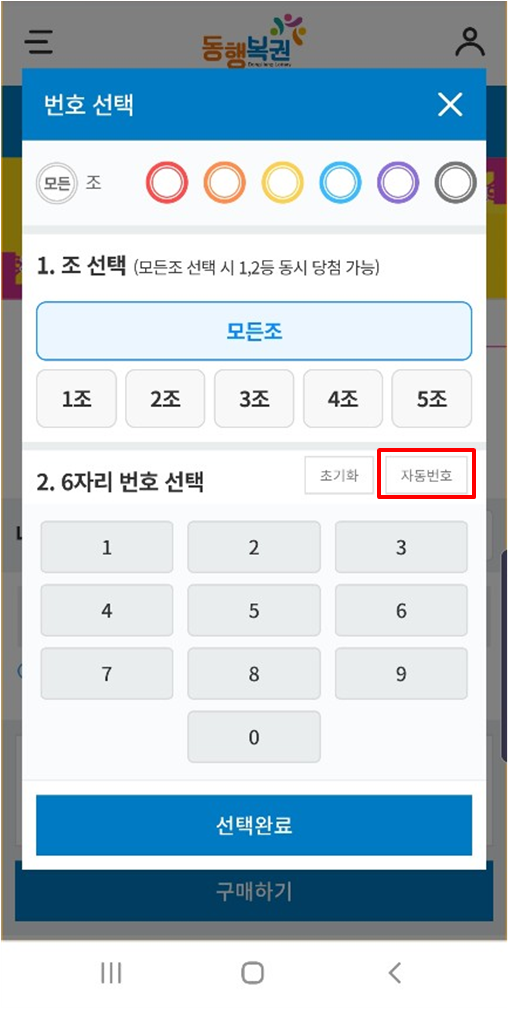4-2. 6자리 번호 선택 : 수동으로 하나씩 선택 또는 [자동번호] 선택 이후 마지막으로 [선택완료]를 누릅니다.